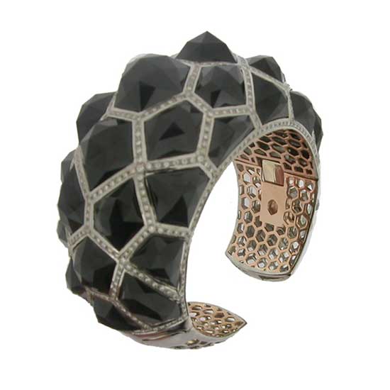 The black spinel bangle boasts a textured finish for a touch of style. The white diamonds offer added allure and brilliance to the bangle. Enhance your personal style effortlessly with this black spinel bangle.