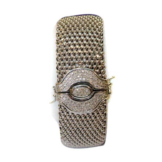 Showcased is an 18K gold bangle featuring an elaborate appearance. It is set with diamonds to attain enhanced attractiveness. Pair this gorgeous piece with other grand jewelry for your coming evening parties.