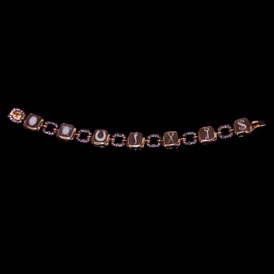 The gorgeous 18K gold bracelet consists of a chain of hollow square and cubic charms. The hollow squares are embedded with tiny purple sapphire, glistening in unrivaled radiance. The gold bracelet features a luck theme with patterns like scissors, money signs, keys, etc. on the cubic charms.