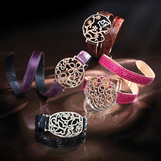 Presented here is a collection of gold bracelets with long, colorful straps. Charming leather patterns complement the floral adornments nicely. This bracelet adds a sweetness and elegance to any lady.