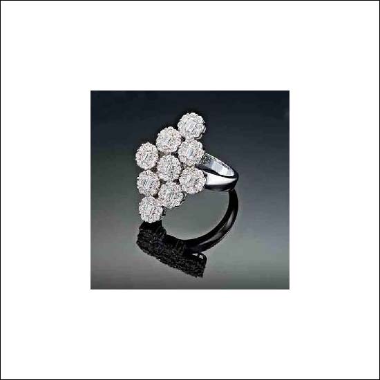 An 18K gold diamond ring that is made with 9 floral shaped diamonds and shaped into a diamond shape