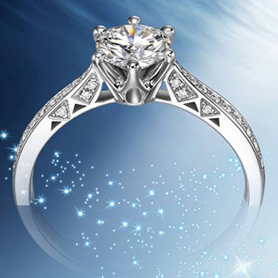 This is a diamond wedding ring with a 18K white gold setting. A round brilliant-cut diamond is secured on a six-claw setting. The ring shank is set with small diamonds as well to accentuate the main stone, making it looks more shiny and glamorous.
