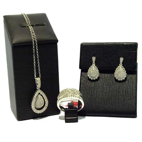 This jewelry set flaunts a uniform design. The necklace features a pear-shaped pendant surround by a frame in the same shape. The earrings share the same pear shape. The ring boasts a thick band. The set makes a perfect addition to your jewelry store.