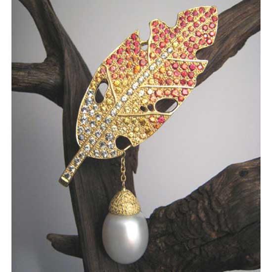 The beautiful brooch flaunts the appearance of a worm-eaten leaf with exquisite details. The removable dangling South Sea pearl displays an irresistible beauty that freezes your attention. Add a touch of vibrant glisten to your evening ensemble with this fascinating brooch.