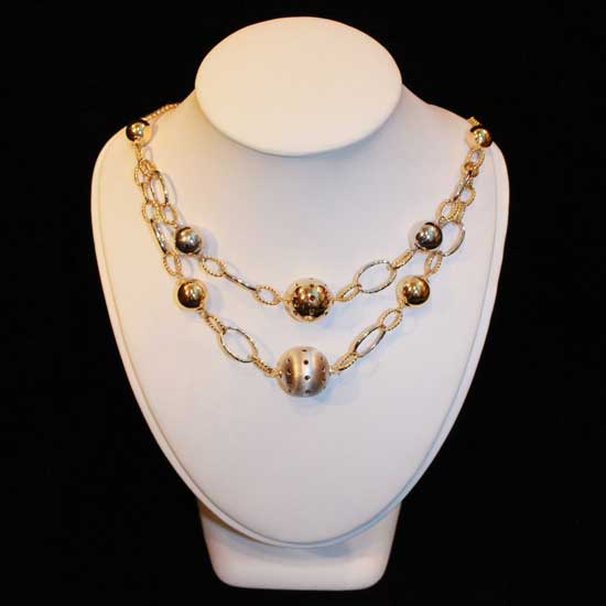 The 18K gold necklace features a 2-layer design with chain construction. It is adorned by metal balls in large and small sizes for a decorative touch. Accessorize an elegant evening look with this gorgeous necklace.
