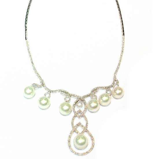 Highlighted is an 18K white gold necklace accented with dazzling white diamonds. The dangling south sea pearls are priced for their high luster. This splendid necklace is sure to capture attention.