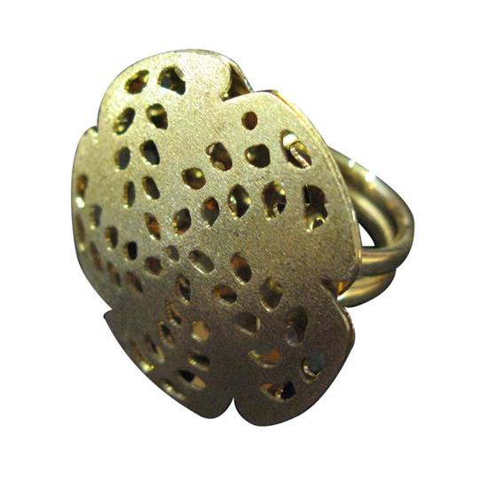 This is a 18k gold ring with an openwork flower pattern, which is for ladies and women. A convex piece of ornament in flower shape and openwork design is set on the split ring, which shows a spring and refined ambiance to the jewellery.