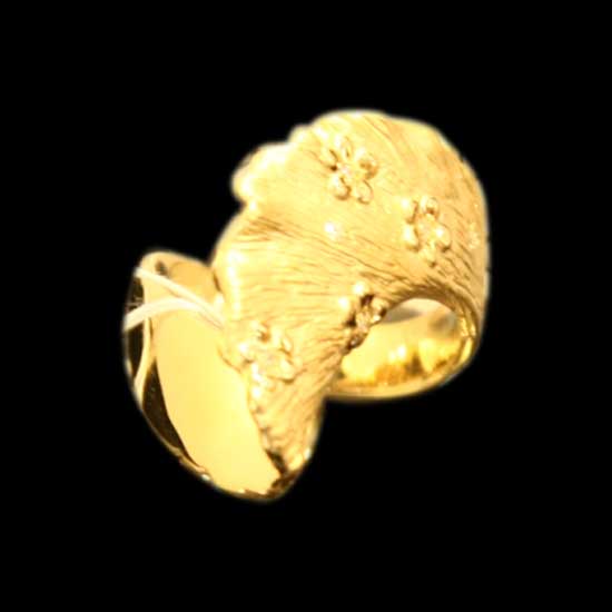The featured ring is made of 18K gold and is suitable for both grand and casual occasions. There are patterns of cherry blossoms on it. The ring is decorated with pieces of diamonds.