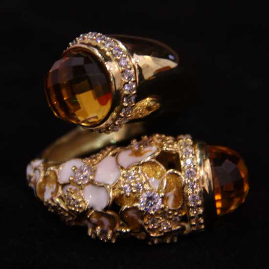 The glittering ring flaunts a unique and glamorous setting adorned with well-made enamel and synthetic stones. Delicately encrusted with precious 18K gold, the ring emits dazzling shine that is irresistible. The enchanting ring is ideal for complementing your jewelry collection.