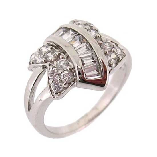 Showcased is an 18K gold ring with a fork-like band. The charm features an angular design, embedded with lustrous cubic zirconia stones with an emerald and round cut. Shining with incredible charm, this 18K gold ring makes everyday a reason to celebrate.
