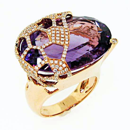 The luxurious 18K rose gold ring boasts a faceted cut oval amethyst embellished with loose diamonds. The clear amethyst integrates the diamond net with a stylish accent. This dazzling rose gold diamond ring is an exceptional gift for your lover.