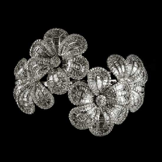 This elegant 18K white gold bangle is an ideal piece to complete your jewelry collection. The whole bangle is embellished with many small pieces of diamonds, giving an ultra glittering effect. The gorgeous floral appearance will appeal to you instantly.