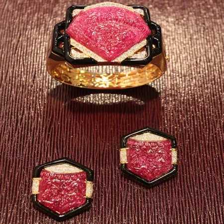 The admirable ladies' jewelry set is completed with a bangle and a pair of earrings in the same design. The 18K white gold setting radiates an irresistible glow of beauty and long-lasting shine. Exquisitely crafted with twinkling diamonds, ruby stones and onyx stones, this 18K white gold diamond jewelry set is sure to blow your mind away with its astonishing elegance.
