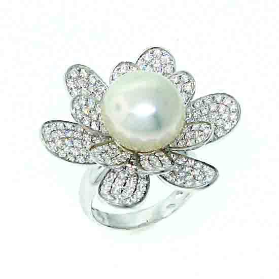 The 18K white gold diamond ring is encrusted with sparkling white diamonds in a flower design. It comes with a polished South Sea pearl in the middle of the petals for a flattering look. This luxurious white gold diamond ring is the perfect ring for your proposal.
