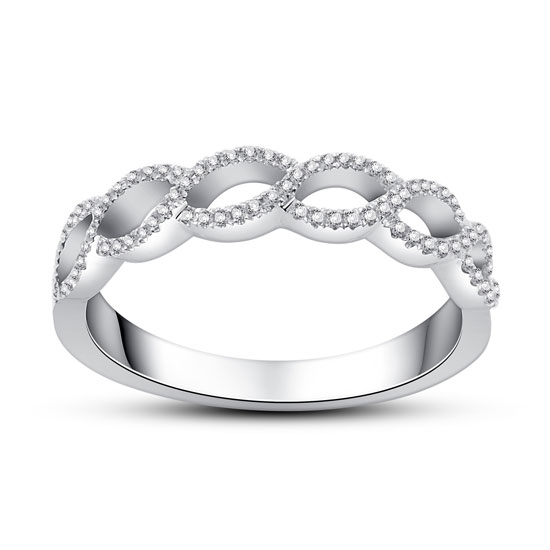 This is an 18-karat white gold ring that shimmers with a high-gloss finish. It is well laid with shimmering white diamonds on the unique band for added style. This elegant ring is a great item for adding some glamor to your slender finger.