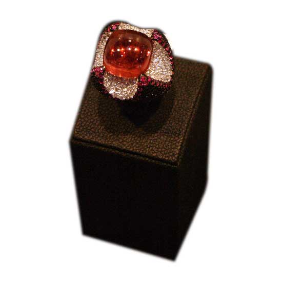The 18K white gold ring comes with a gorgeous ruby in the middle. It is paved with black and white diamonds for a glamorous touch. This fancy ruby ring is a gorgeous accent for a night out on the town.