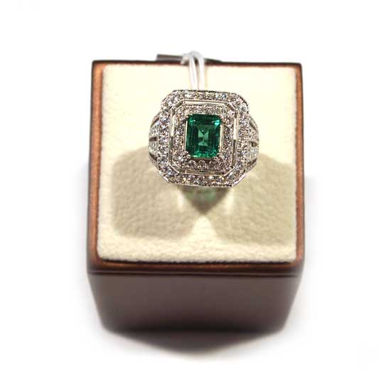 This stunning ring features an emerald-cut green stone encircled by shimmering white stones. Crafted of 18K white gold, the ring showcases a polished, glimmering finish. The beautiful ring will add charm and beauty to any evening look.