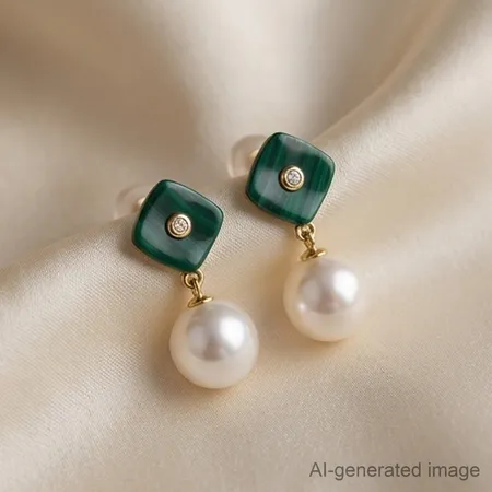 18K YELLOW GOLD EARRINGS WITH MALACHITE AND DIAMOND AND 7.5-8MM ROUND FRESHWATER PEARL