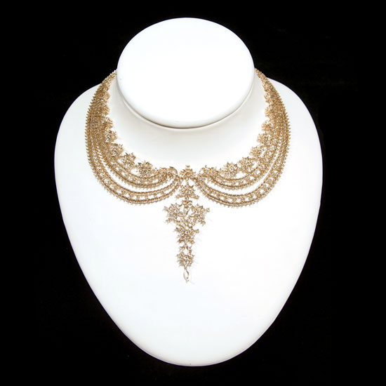 The necklace mounting with an ornate design is done with attention to detail. The 18K yellow gold composition offers a flair of luxuriousness and elegance. This piece of jewelry can be enlivened by either stones or diamonds.
