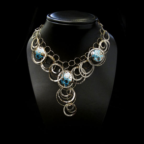 Showcased here is a bold 18k gold loop necklace of an ethnic design. Round decorative plates are adorned with turquoise detail for a refreshing touch. It is an exquisite choice to wear with your evening gowns and party dresses.