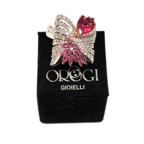 This stunning ring features a multi-band design paved with sparkling white diamonds. The alluring pink tourmaline stones add charm and beauty to the piece. This beautiful ring makes a lovely gift for someone special.
