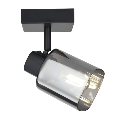 1Lt Spot Light Square, Material:Metal+Glass, Bulb:1x E14 Max.40W, Product Size:L90*W90*H135mm, Colour:matt black+smoke glass , Packing:white box+colour label