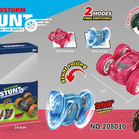2.4G LIGHT MINI FOUR WHEEL DOUBLE SIDE STUNT CAR 1- Play time: 15-20 mins,2- Charging Time: about 60 mins,3- Control distance: 15-20M,4- Car battery: 3.7V 300mAh rechargeble battery (included),5- Remotor Battery: 1.5V AAx2 battery (not included),6- Accessory: USB charger x 1,7- Product size: 10x 9 x 5cm,8-Function:2.4G,go forward/back,turn left/right,double-sided driving,360 spin,characteristic light