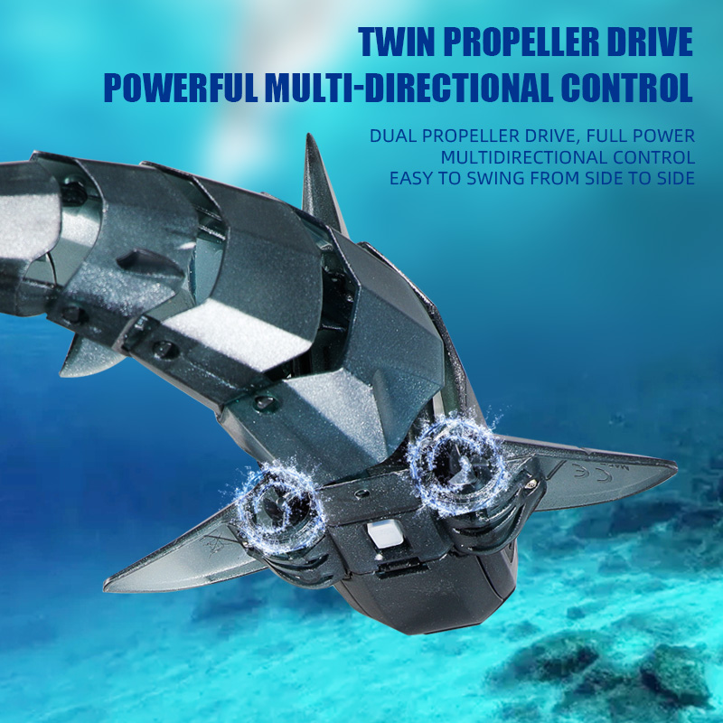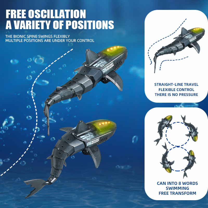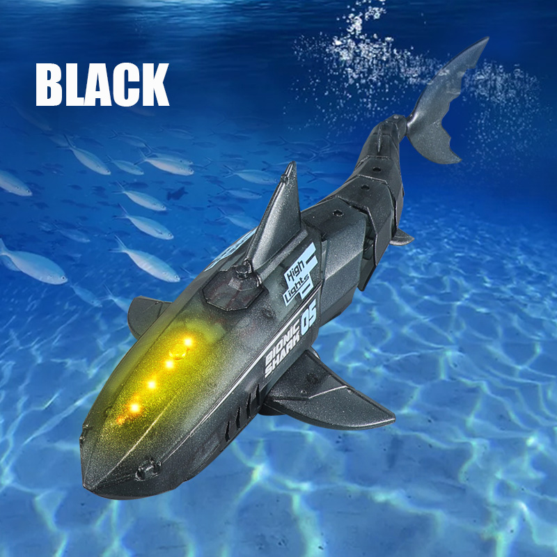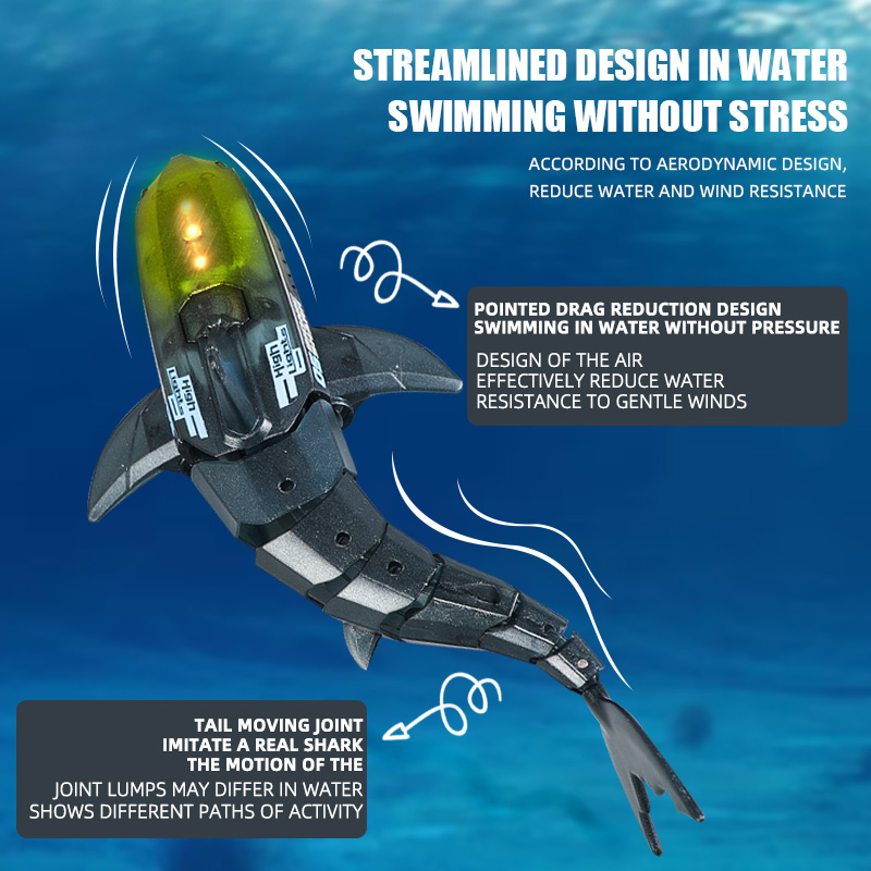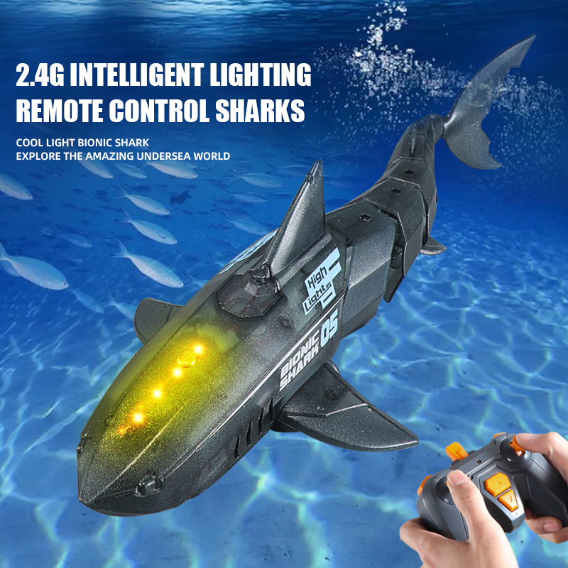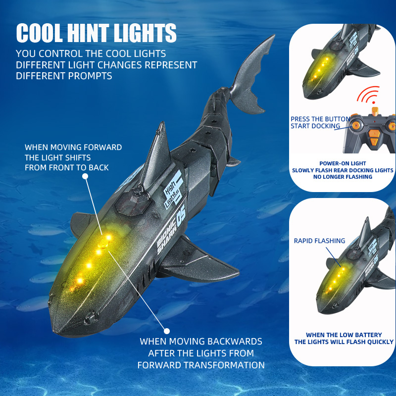 2.4G RC LIGHT WATERPROOF BIONIC SHARK 1- Play time: 15-20 mins,2- Charging Time: 30-60mins,3- Control distance: 15-20M,4- Swimming Speed:3-4KM/H,5- Body battery: 3.7V 350mAh rechargeble Li-po battery (included),6- Remotor Battery: 1.5V AAx2 battery (not included),7- Accessory: USB charger x 1,manual x 1,8- Product size: 35x14 x 11cm,9-Function:2.4G,four channels,characteristic light,water surface go forward/back,turn left/right,demo,swimming