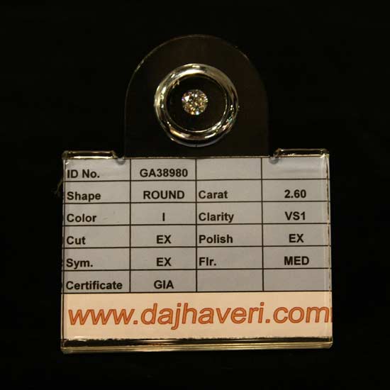 The certificated diamond, weighing 2.6 carats, is exquisitely cut in a popular round shape for maximum brilliance. It comes accompanied by a diamond grading report from the GIA for guaranteed quality and value. This dazzling diamond is great for engagement rings or earrings.