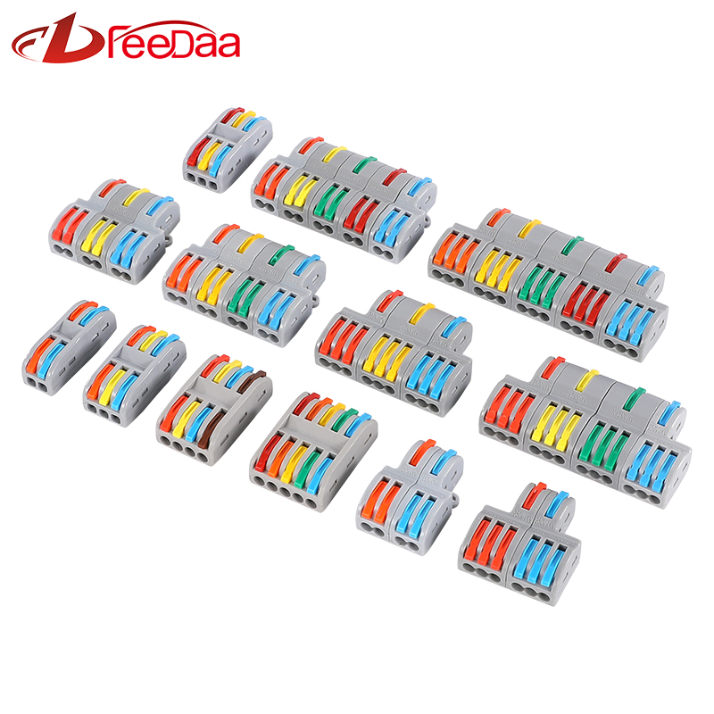 The connector shell is made of flame-retardant nylon PA66/PC new material, and the inner guide is made of all copper. It can be used for both soft and hard wires, There are multiple inputs and multiple outputs such as 2 in 4 out, 2 in 6 out, 3 in 6 out, 3 in 9 out, etc, and the wiring range is 0.08-4.0mm²(Single hard conductor), 0.08-4.0mm²(Multi-strand flexible conductor), It is a spliced version upgraded and integrated version