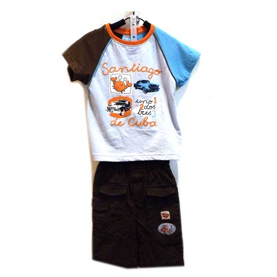 The two-piece garment set includes a T-shirt with different colored sleeves and a pair of twill shorts. The cute prints and patches add a touch of style. This garment set makes a great choice for your little one.