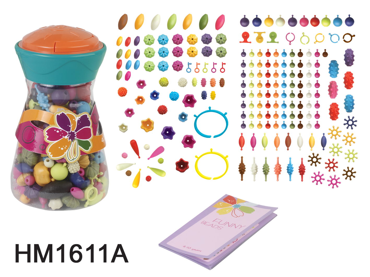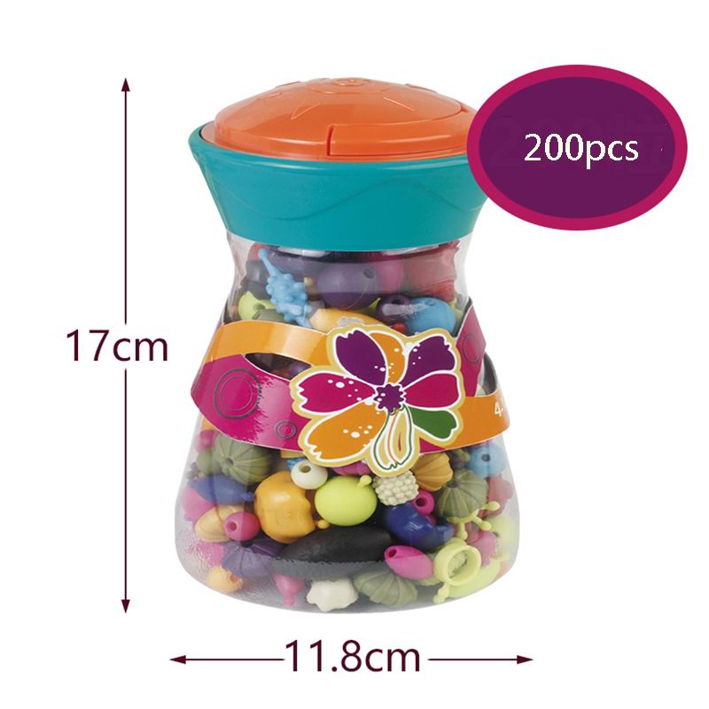 Mix and match with Pop-arty beads. Simply pop them together or click them apart to create great new combinations! 300 pieces of different colors and shapes of beads. Comes with a storage jar to store all of your beads in.