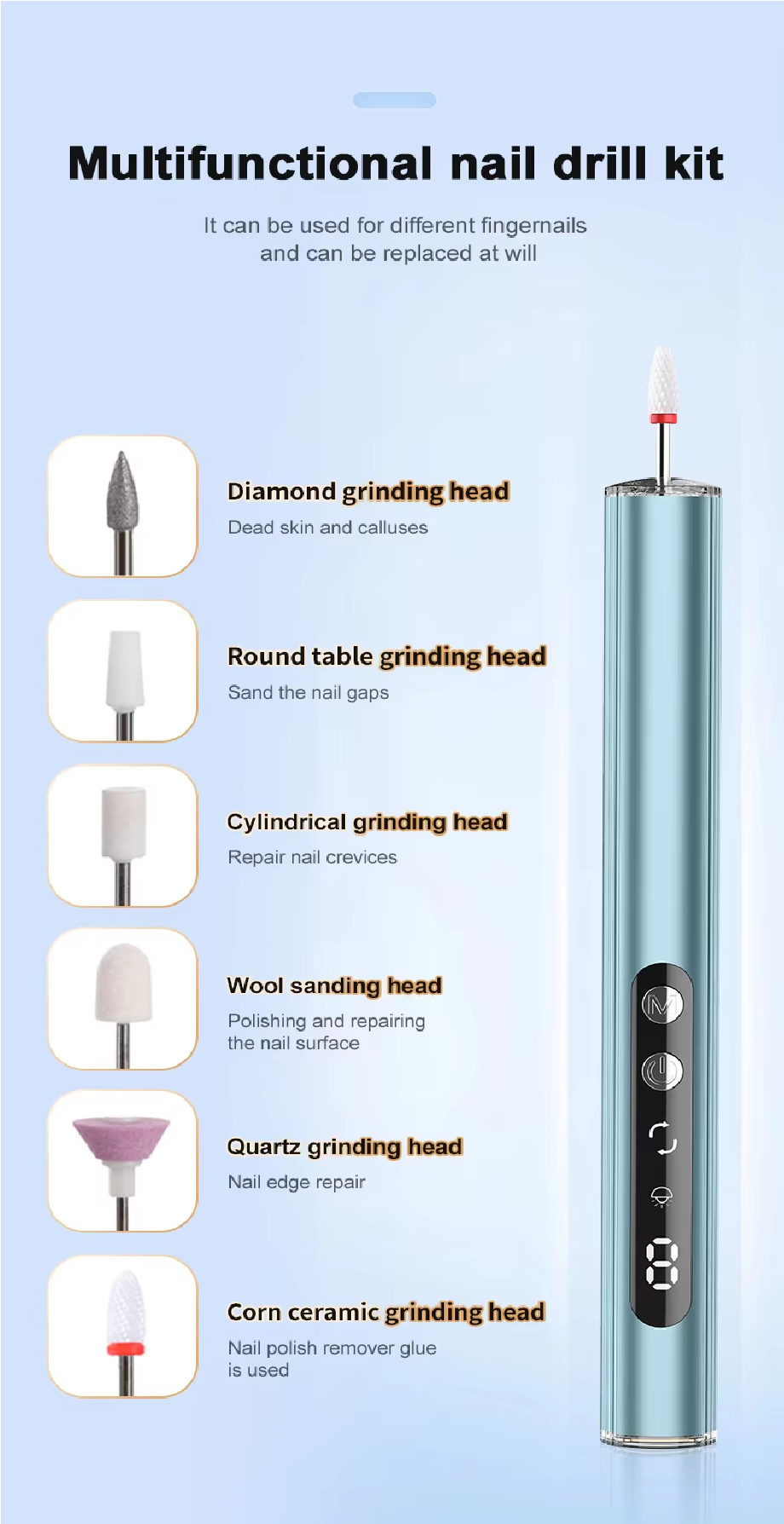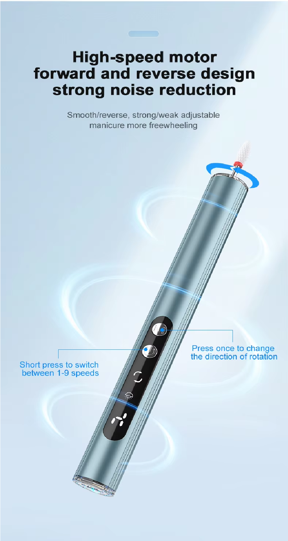 • LCD display & 9 intensity level settings -  adjust the grinding according to your needs, useful for nails of different types and thicknesses