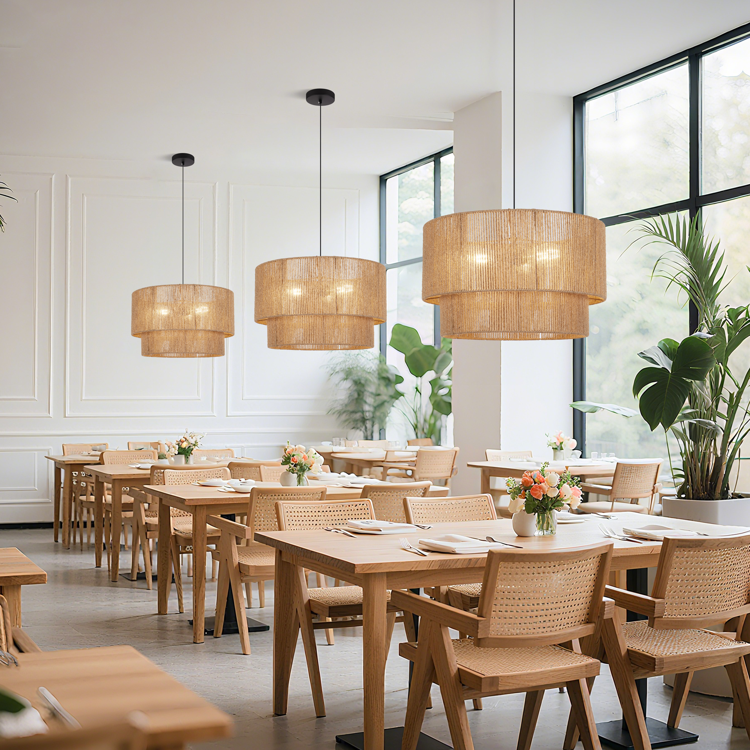 Crafted from natural rattan, they bring a touch of bohemian charm and warm, ambient lighting to any room—be it a restaurant, cafe, or home dining area. The handwoven texture adds an organic, cozy vibe that effortlessly complements various decor styles, from coastal to rustic. Not only do they illuminate your space beautifully, but they also serve as eye-catching statement pieces. Perfect for creating a welcoming atmosphere anywhere in the world. Transform your interior with this blend of nature-inspired design and timeless elegance.