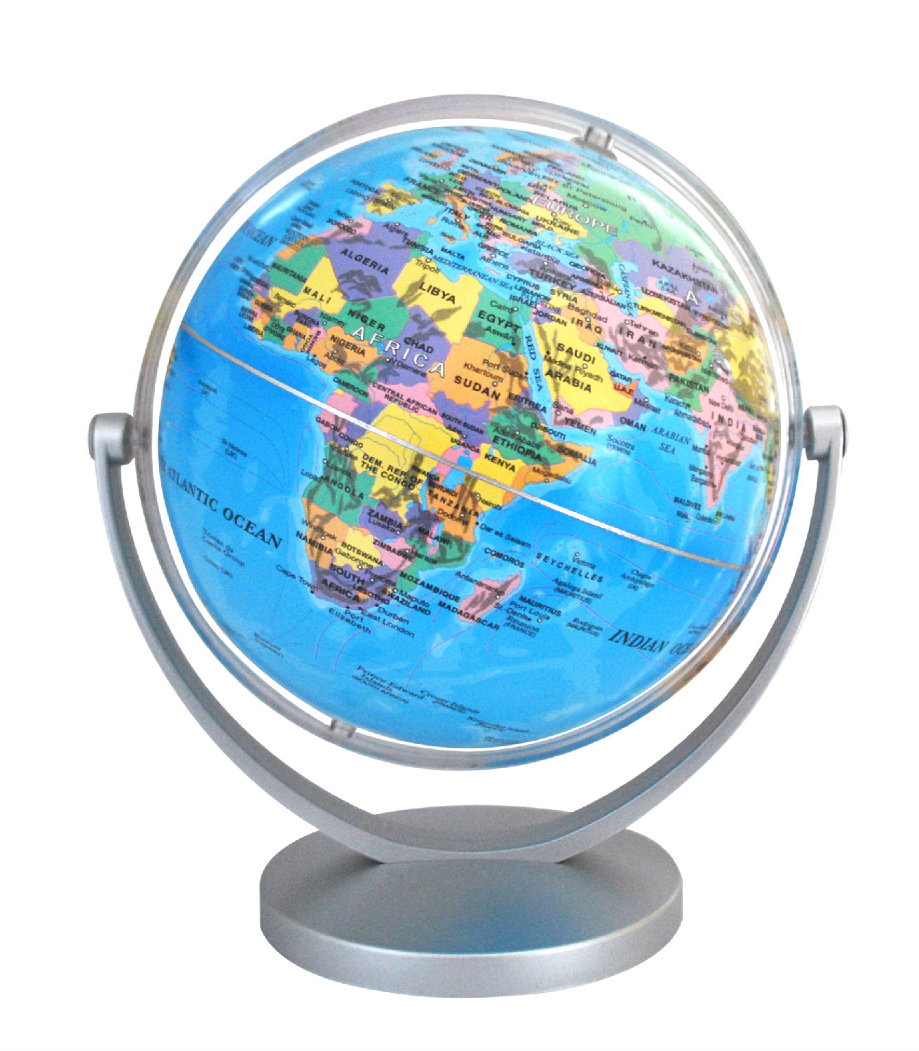 20 cm swivel and tiltable globe. Political map with blue sea. With silver base. Various languages available.