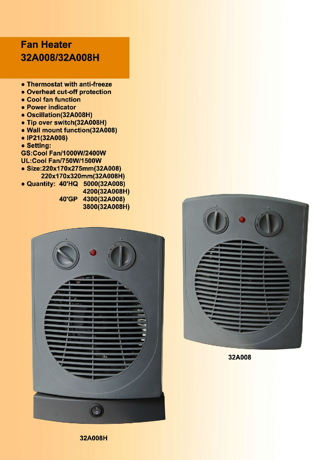2000W or 2400W Fan Heater 2 Power Setting Thermostat with Anti-Freeze OverHeat Protection Tip-Over Switch (Optional) Auto Oscillation (Optional)
