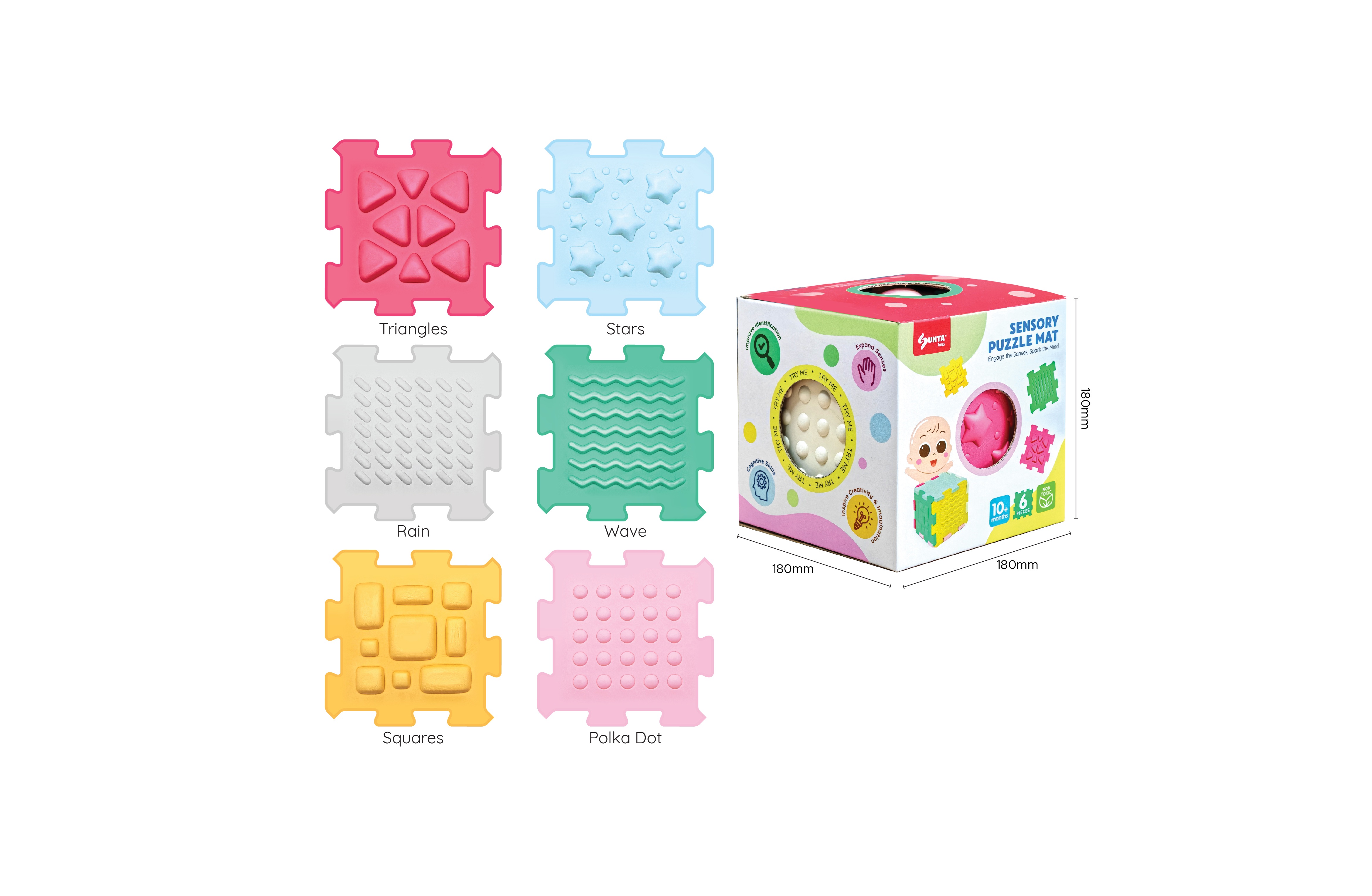 The surface offers varied textures and interactive features that engage touch and encourage motor skills, balance, and imaginative play.