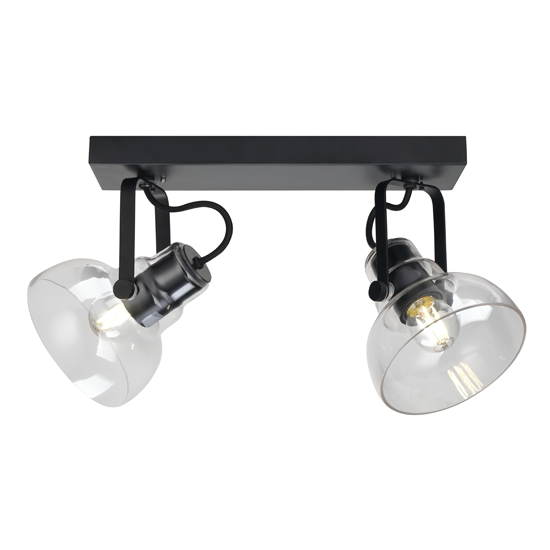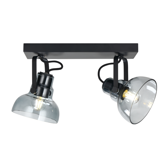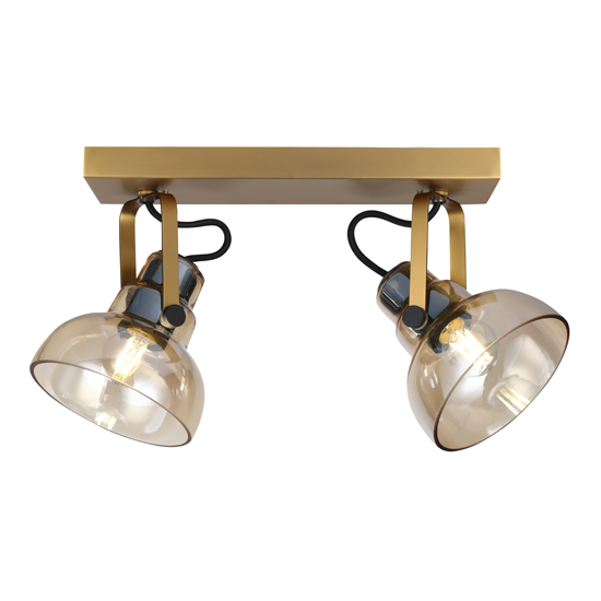 2Lt Spot Light Bar, Material:Metal+Glass ,Bulb:2x E27 Max.40W, Product Size:L382×W142×H210mm,Shade size:Ø142×130mm,Colour:Black + smoke glass,or Gold + Black metal parts / Cognac glass, or Black + Clear glass, Packing:white box+colour label