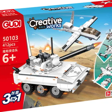 One set can be dismantled and built to three different peacekeeping commando scenes (6 vehicles in total).