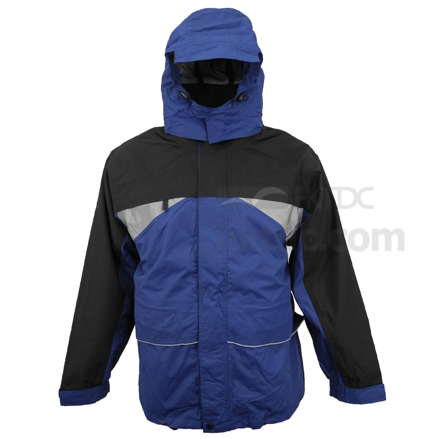 Concealed Hood (hood which can be rolled inside the collar) Triangular reflective material trimming on front & back side underarm Taped seams, Windproof, Waterproof & Breathable 2000mm