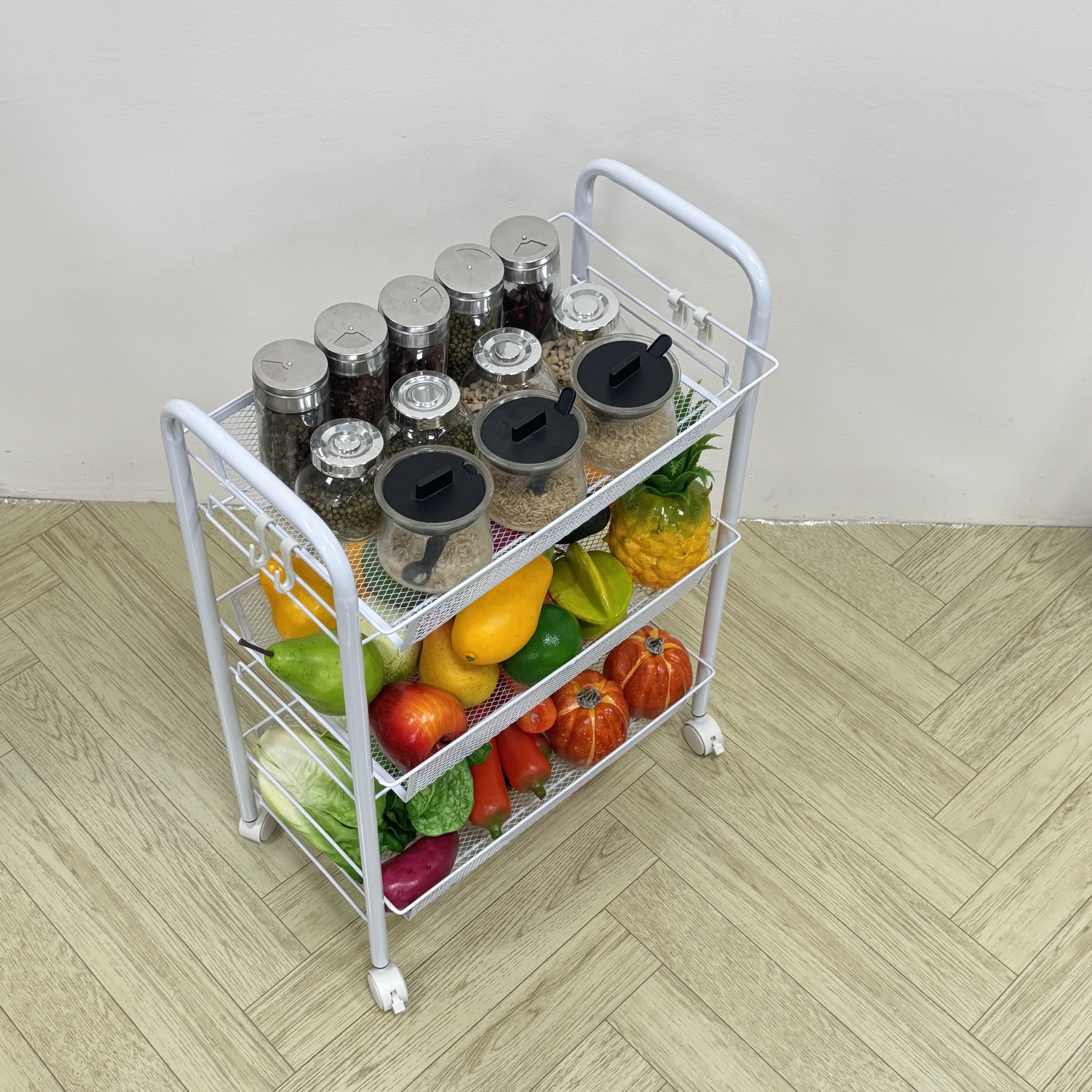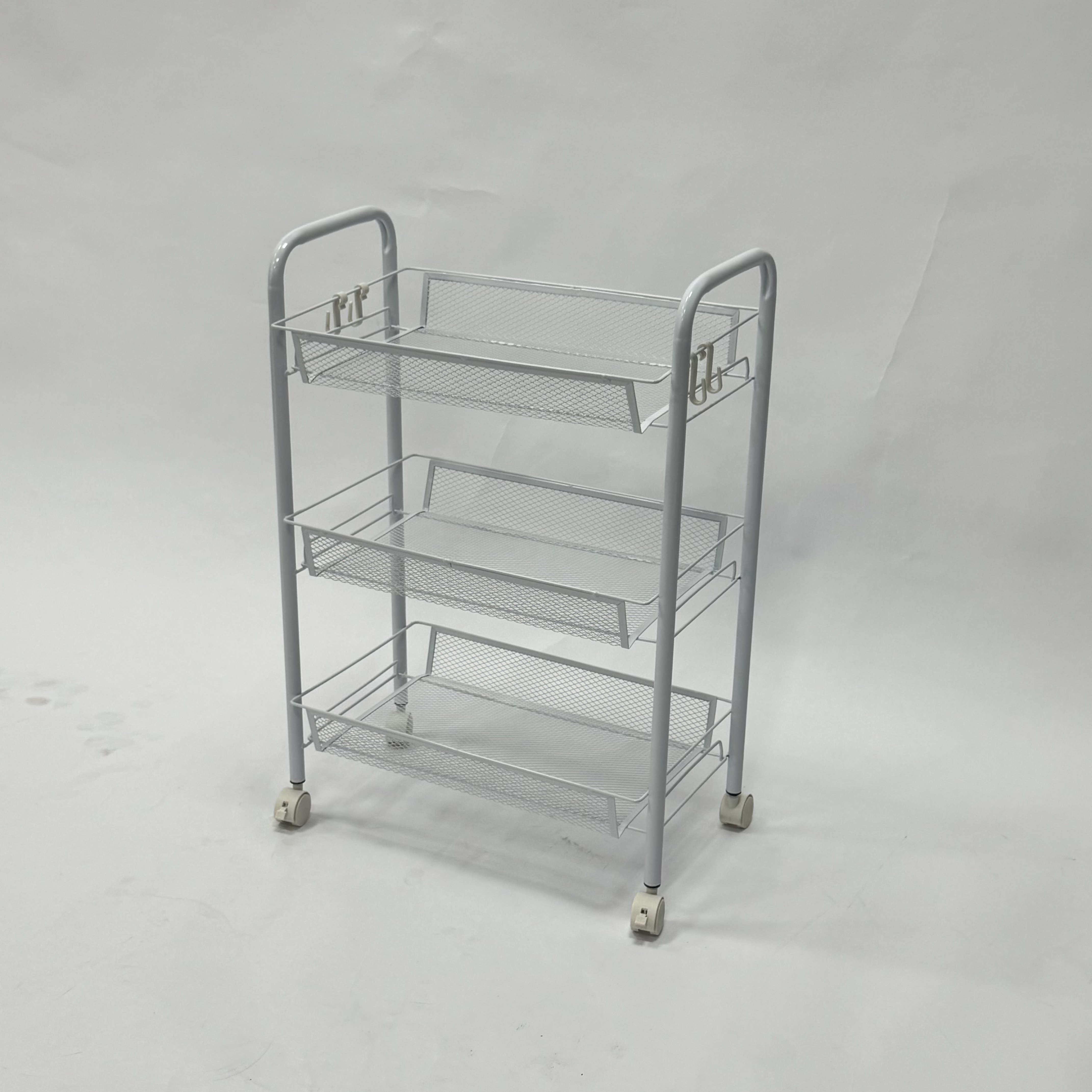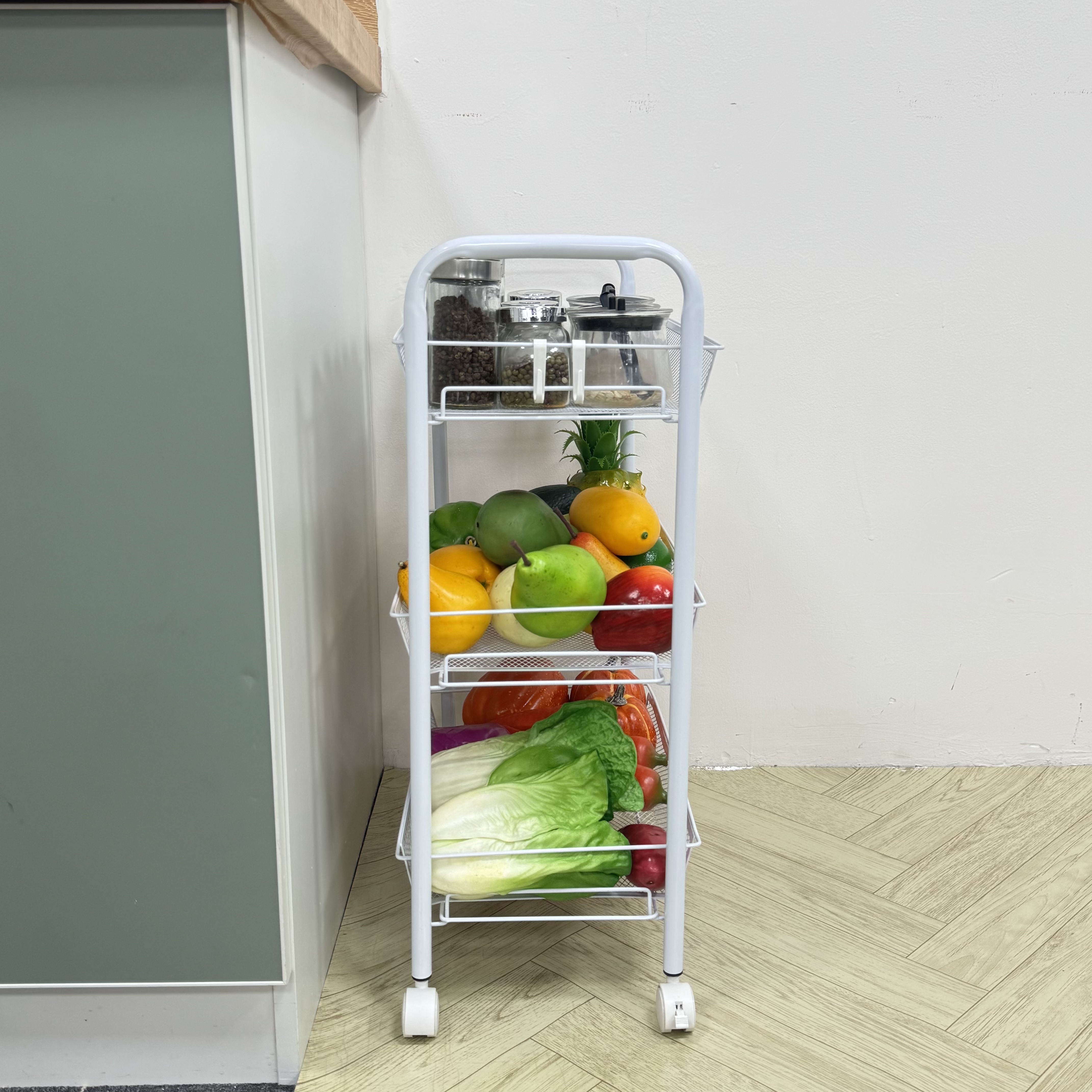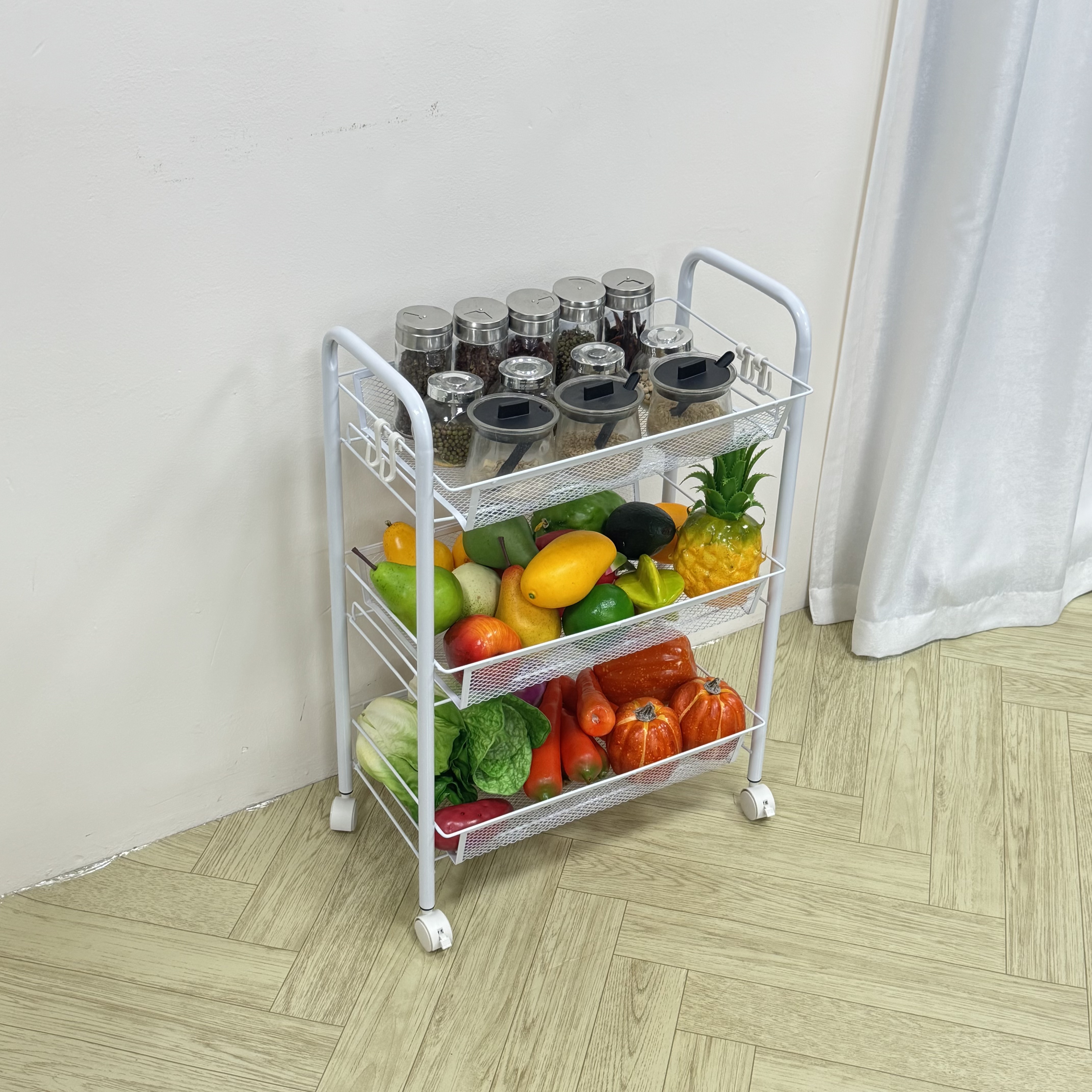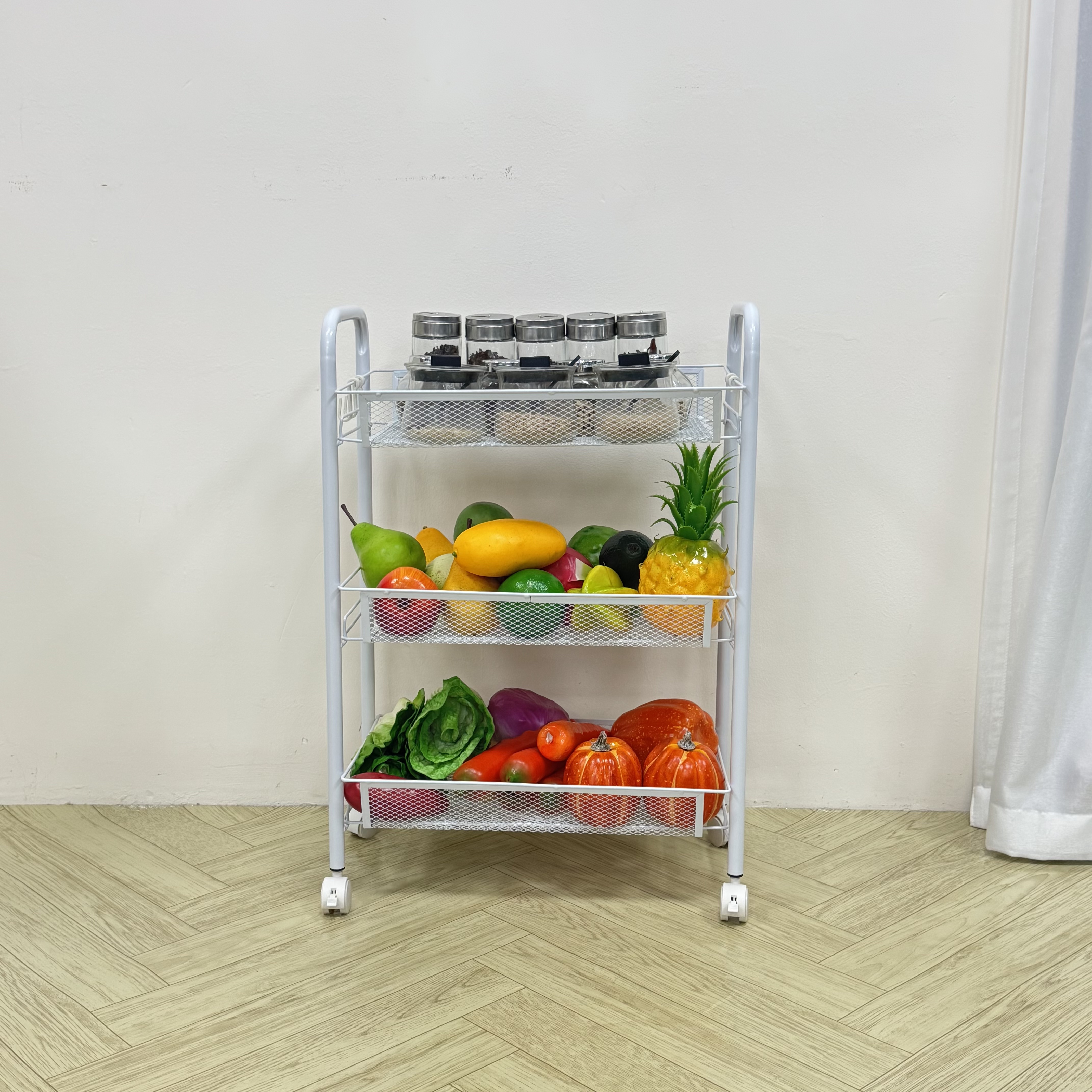 This 3-Tier Metal Mesh Rolling Utility Cart is the ultimate space-saving solution for modern homes and offices. Built with high-strength carbon steel, it combines durability with a sleek, minimalist aesthetic. The ventilated mesh design makes it ideal for storing perishables like fruits and vegetables, or damp items in the bathroom.