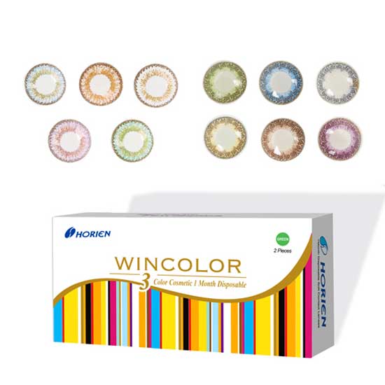 Featured is a box of two-piece monthly disposable color contact lenses. The