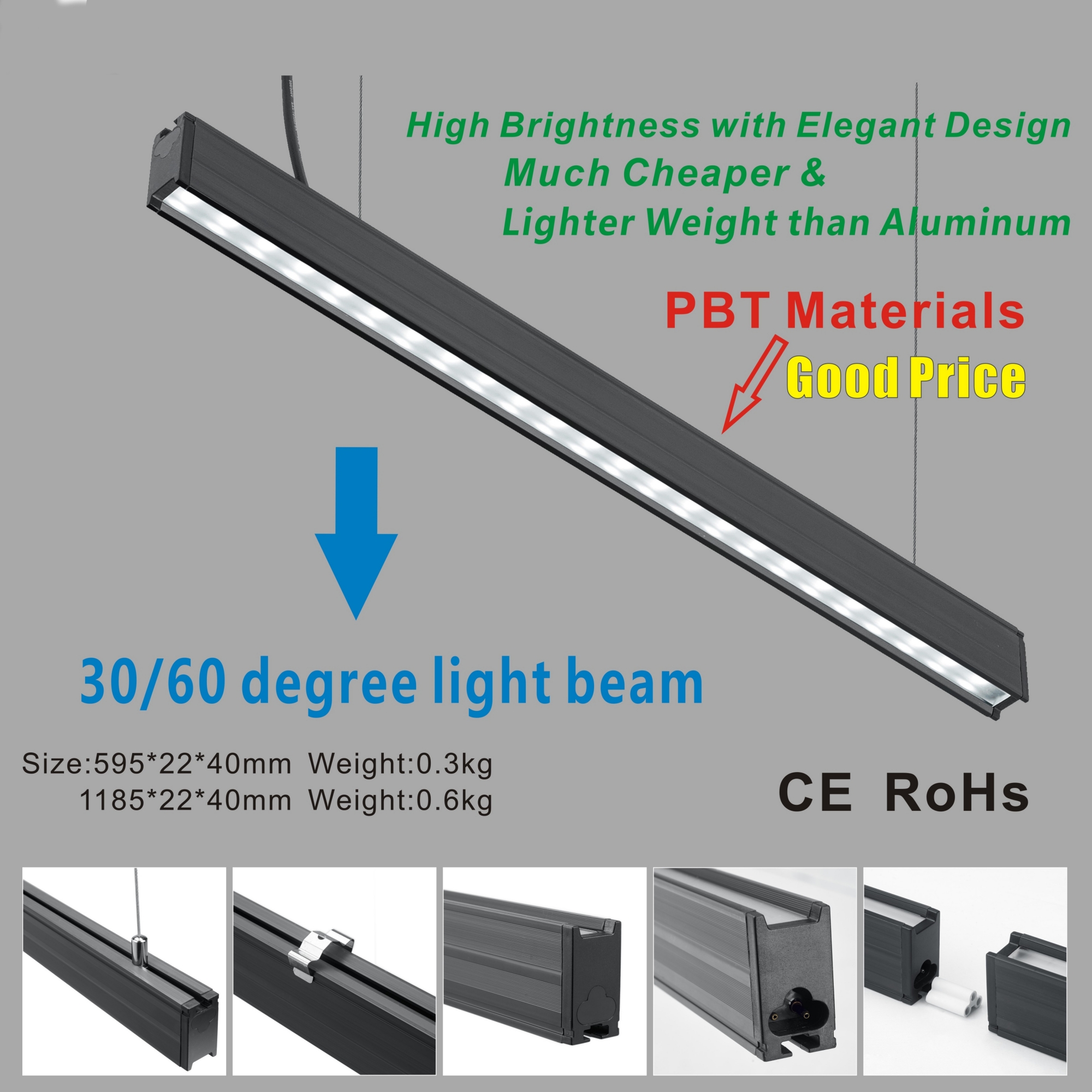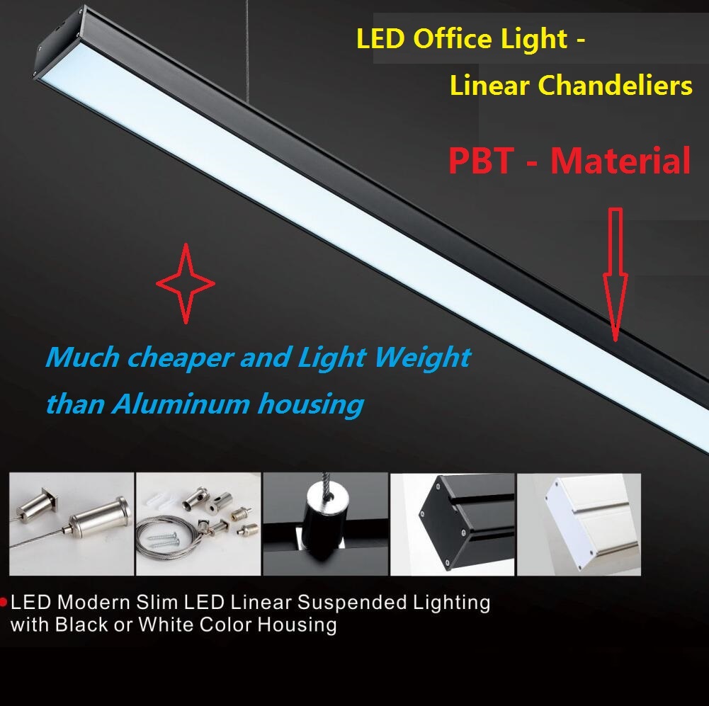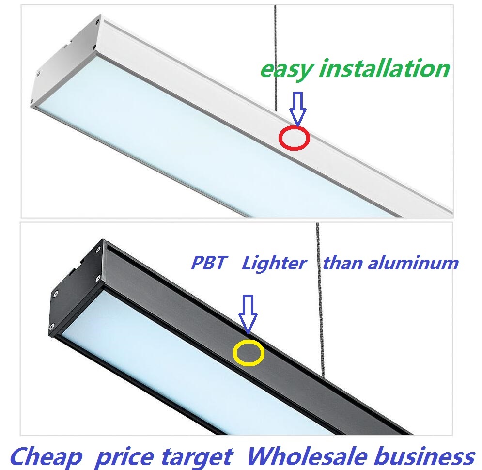 --Feature: 1) PBT materials housing -- much lighter weight & much cheaper in cost than aluminum 2) diffuser PC cover. 3) Its very simple to install by yourself, which can lower cost. 4) Unique & fashion design, can replace T5, T8, etc. 5) various installation way: Suspend or surface mounted. 6) AC 100~240V, just plug & play. 7) Housing color white and black both available. 8) CRI 80 9) Lumen: 85~90LM/W 10) Beam angle: 30 or 60 degree