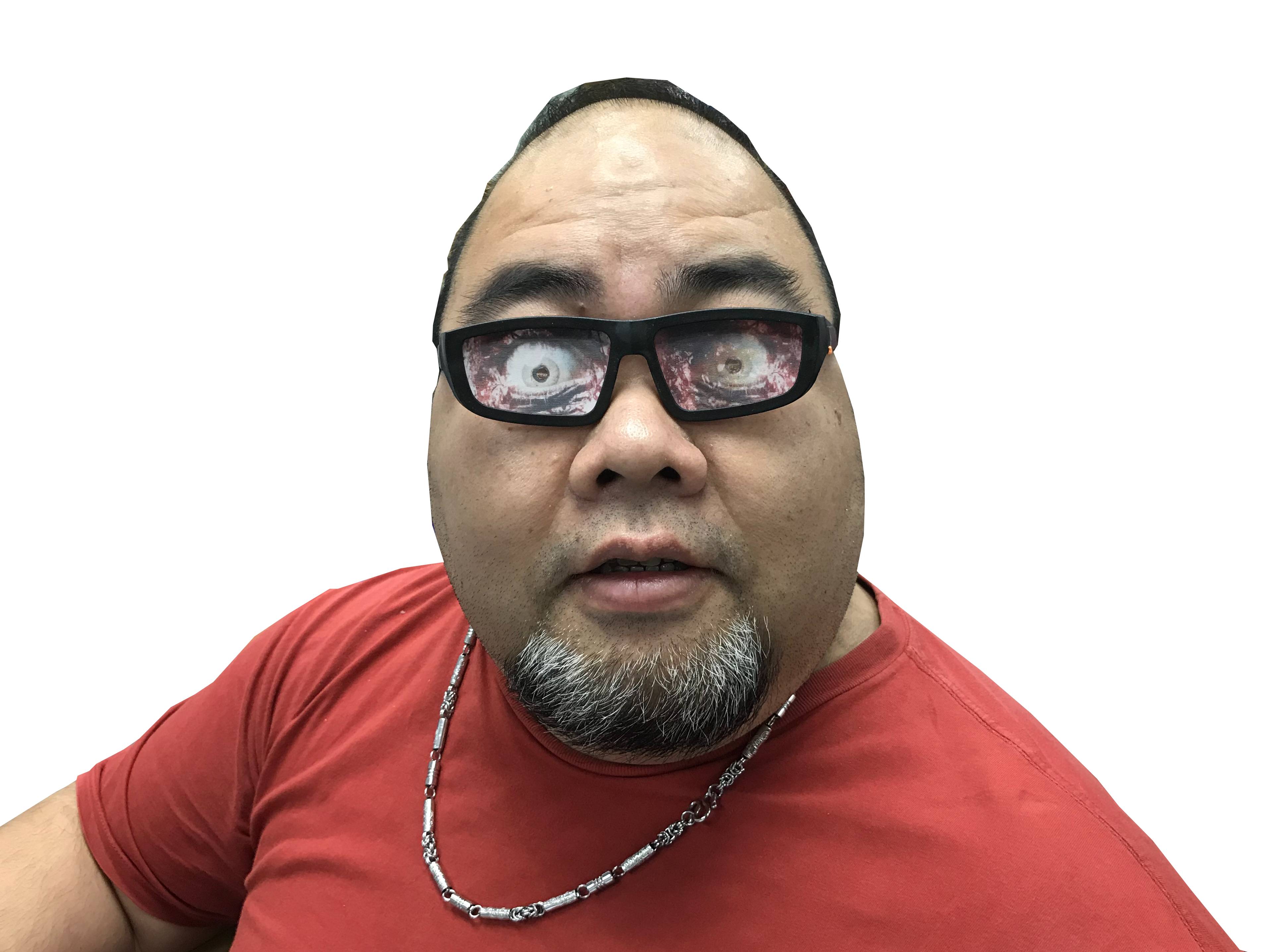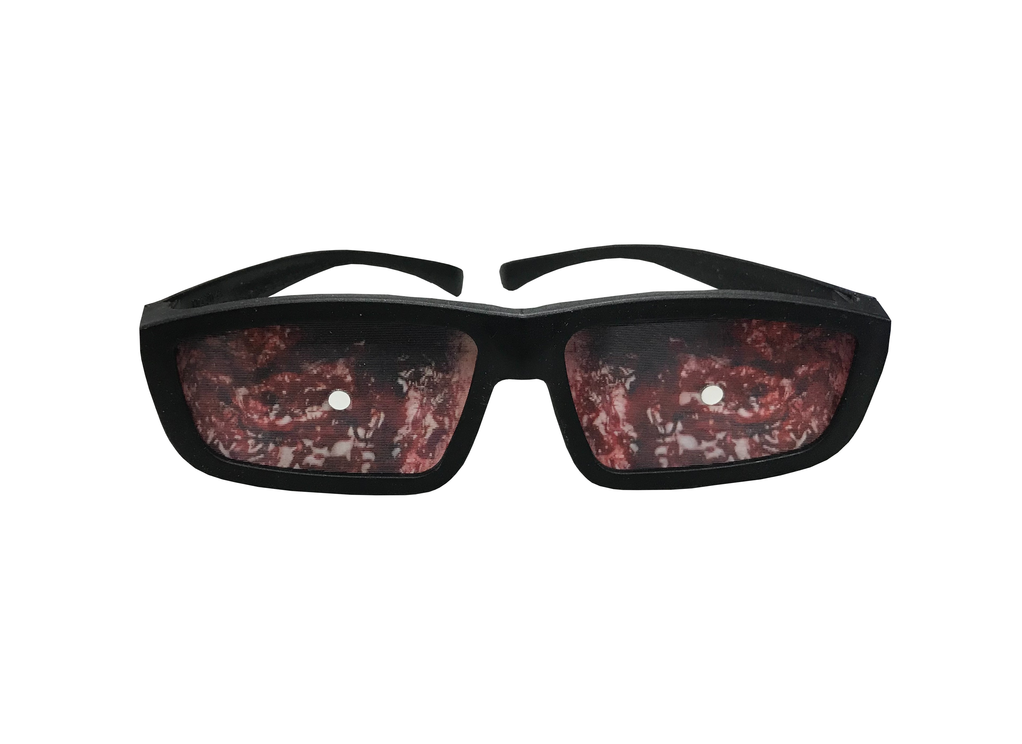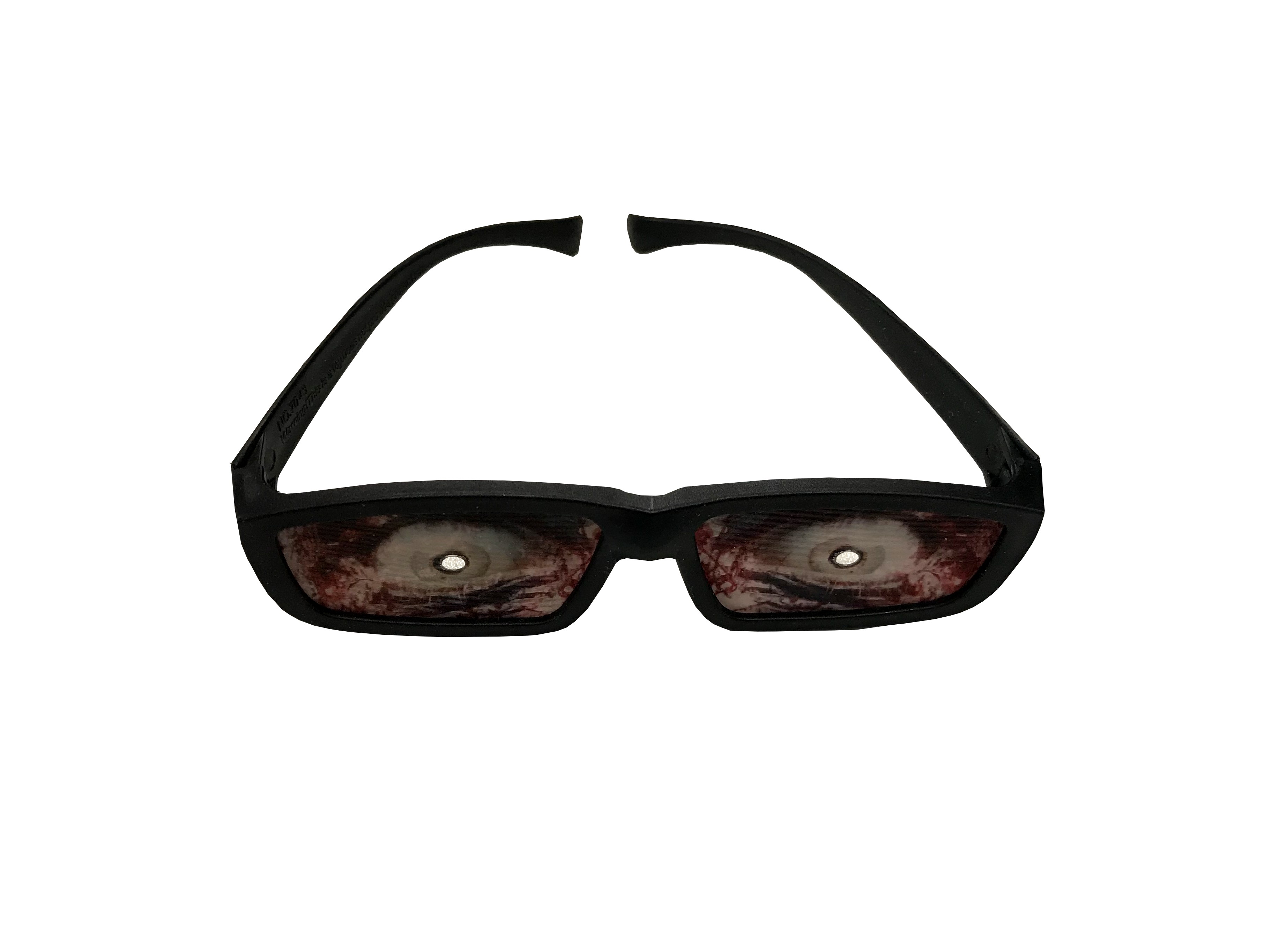 The Zombie Glasses has a 3D zombie eye lens, the zombie eye may show its different shapes when viewing it from different angle. At the central of the 2 lens, there are small holes for one to look outside while wearing the glasses.