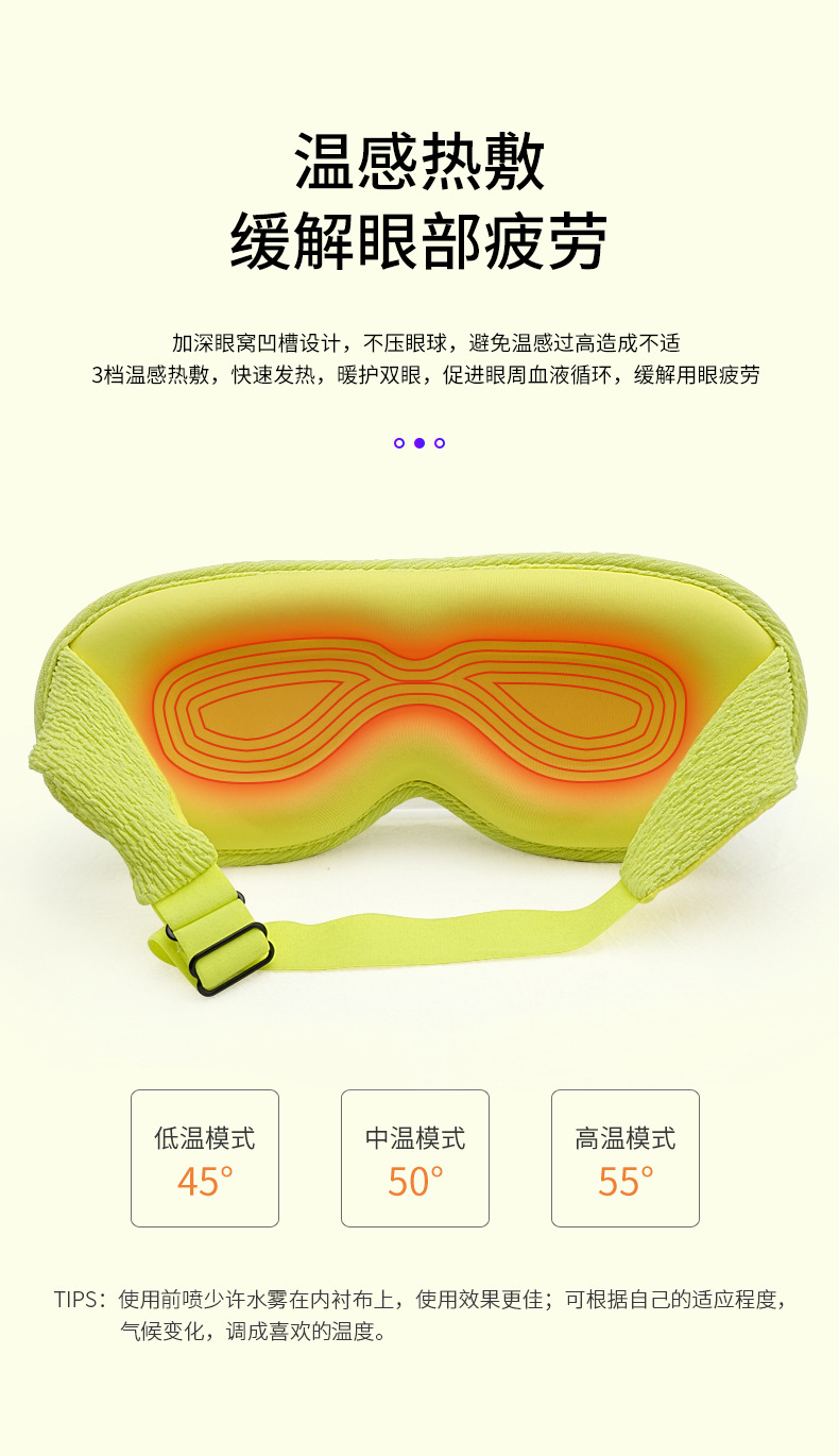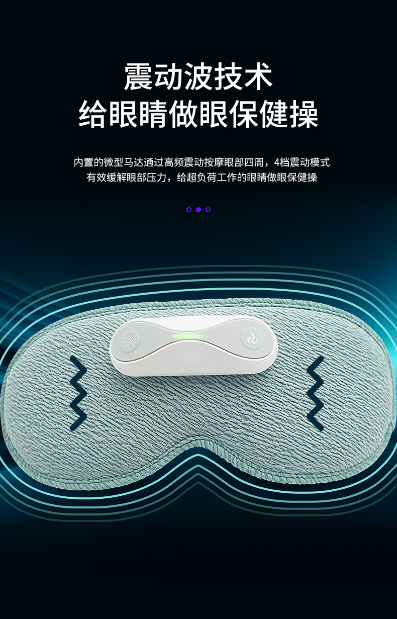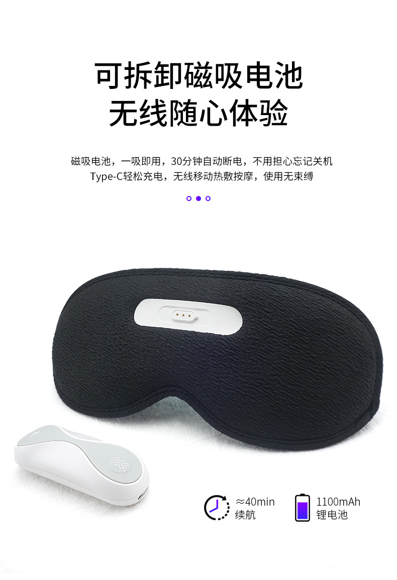 4 vibration modes, 3 hot compress temperatures, adjustable as you like; Magnetic battery, ready to use once sucked, automatically cuts off after 30 minutes; 100% light blocking, protecting your eyes while letting you sleep comfortably; Make your eyes full of energy.