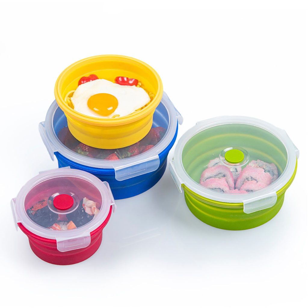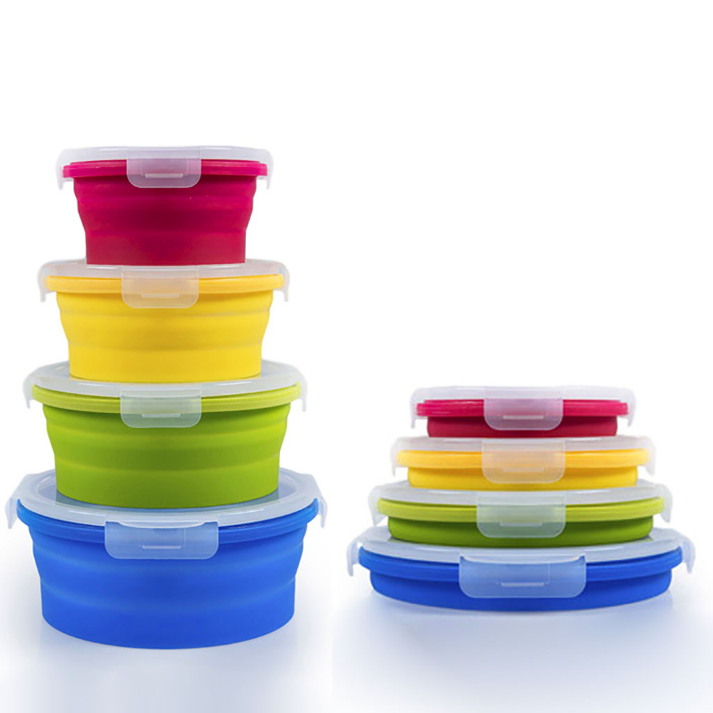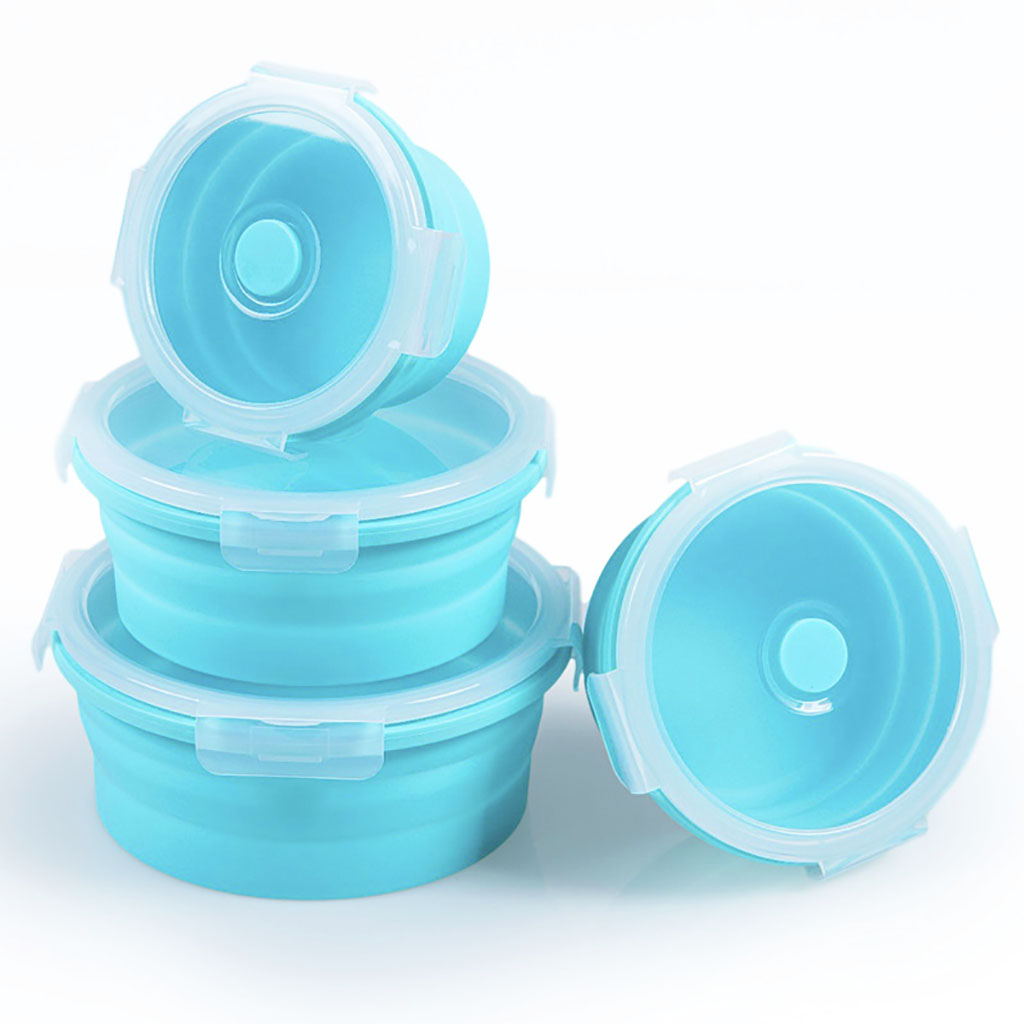 350 ml - Dia. 12.5 cm x H 7 cm (folded of H 3 cm), Weight of 125 grams; 500 ml - Dia. 14.5 cm x H 7 cm (folded of H 3 cm), Weight of 155 grams; 800 ml - Dia. 16.5 cm x H 7 cm (folded of H 3 cm), Weight of 195 grams; 1,200 ml - Dia. 18.5 cm x H 7.5 cm (fol