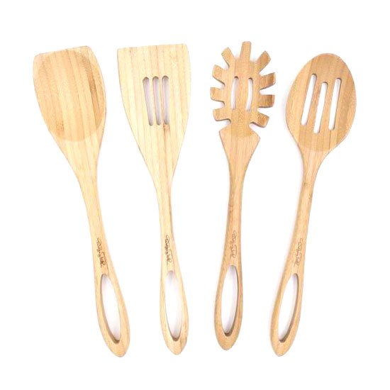 This kitchen tool set consists of a spaghetti server, two spoons and a slotted turner. Each piece is made of carbonized bamboo for good solidness. This excellent set is easy to use and wash.