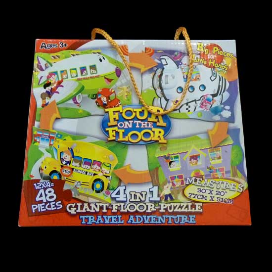 The 4-in-1 giant floor puzzle features a travel adventure theme. This puzzle includes 48 huge pieces in total. It is suitable for players aged 3 years old and above.