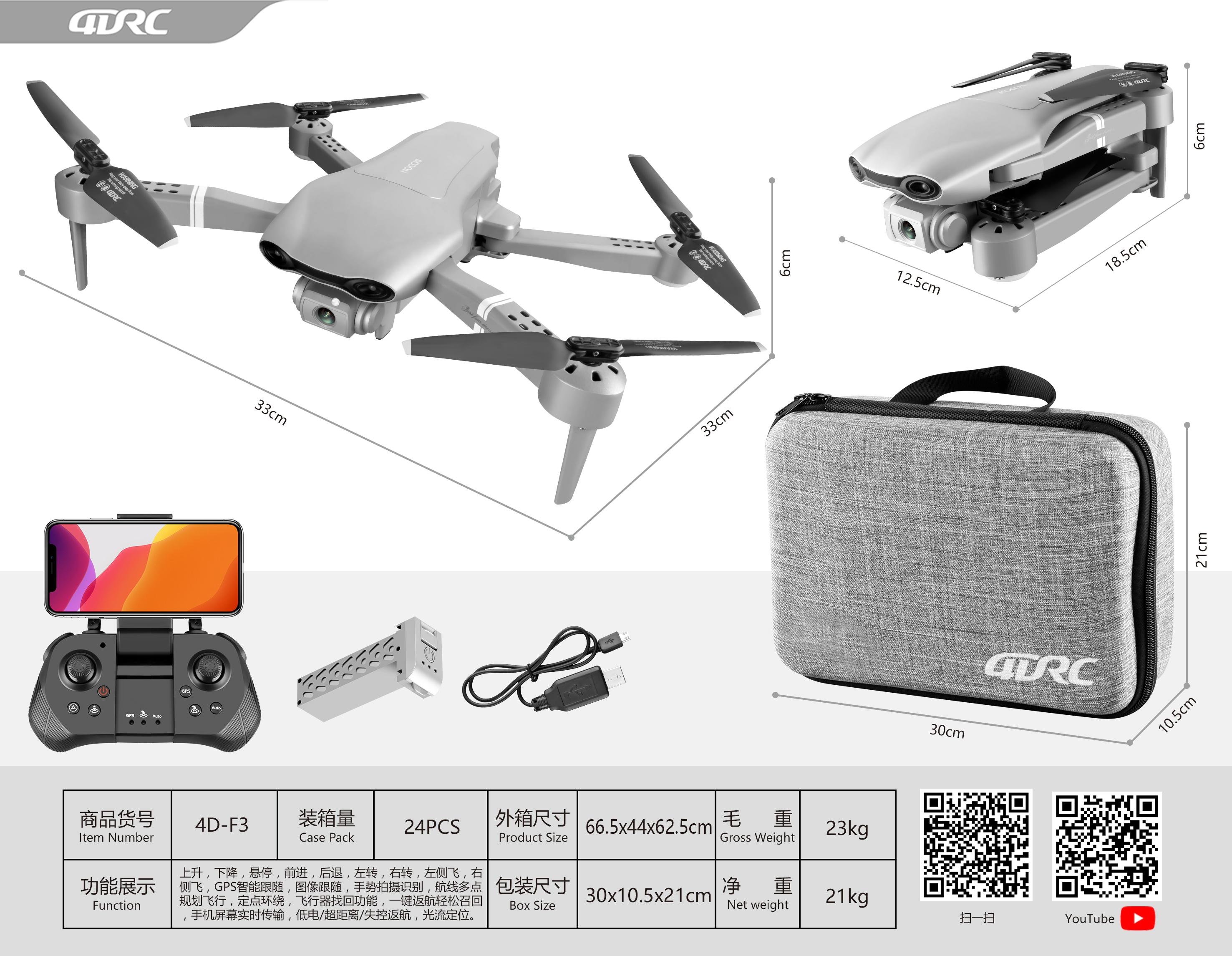 Function: One key take-off/landing, Forward/backward, Turn left/right, Left/right side-flying, Ascent/descent, Altitude hold, Auto hover/flip, Headless mode, Roll over to stop, WiFi camera with selfie, APP FPV real time transmission. (Only Available for GPS Option, GPS positioning, Auto return if low battery or over distance or out of control, Waypoint flight/Circle flight)