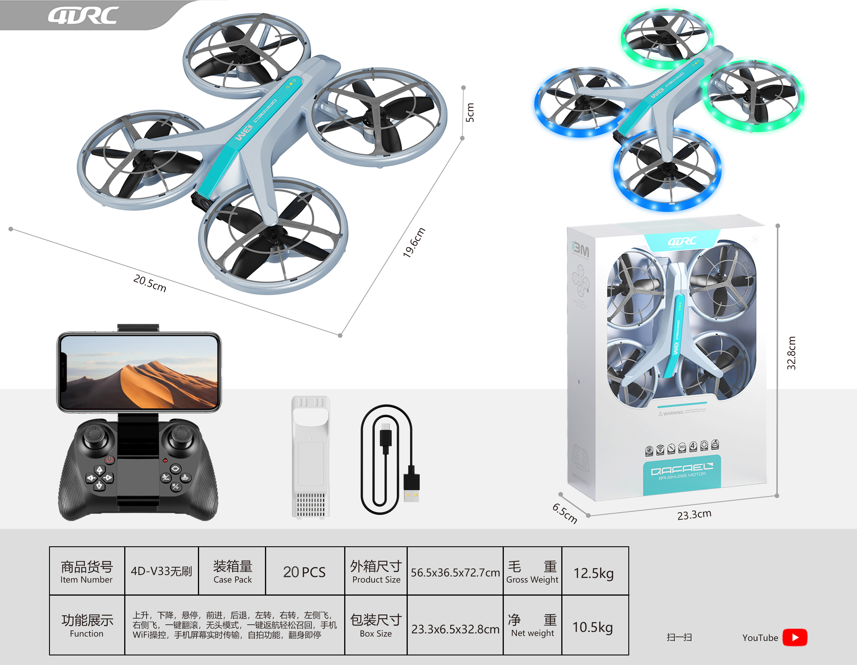 Function: One key take-off/landing, Forward/backward, Turn left/right, Left/right side-flying, Ascent/descent, Altitude hold, Auto hover/flip, Headless mode, Roll over to stop. (Only Available for Camera Option, WiFi camera with selfie, APP FPV real time transmission)